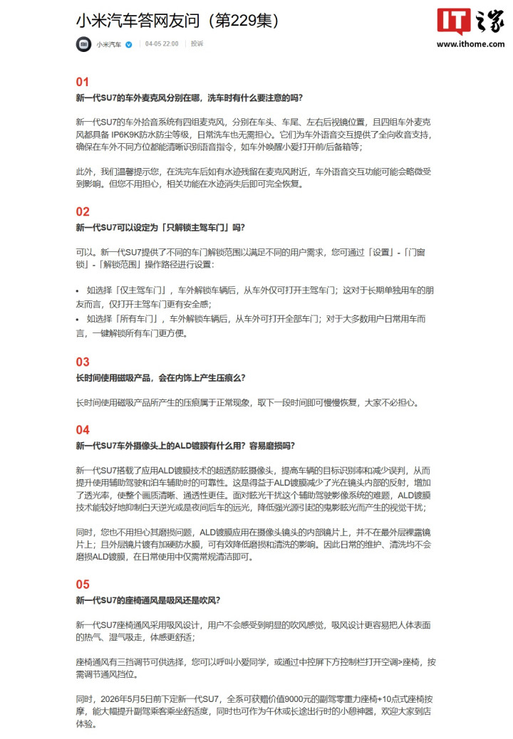 4 月 5 日音尘,小米汽车本日赓续更新答网友问(第 229 集),针对新一代 SU7 的车外麦克风差别在哪、洗车时的防卫事项、是否不错设定为「只解锁主驾车门」等问题进行了解答。