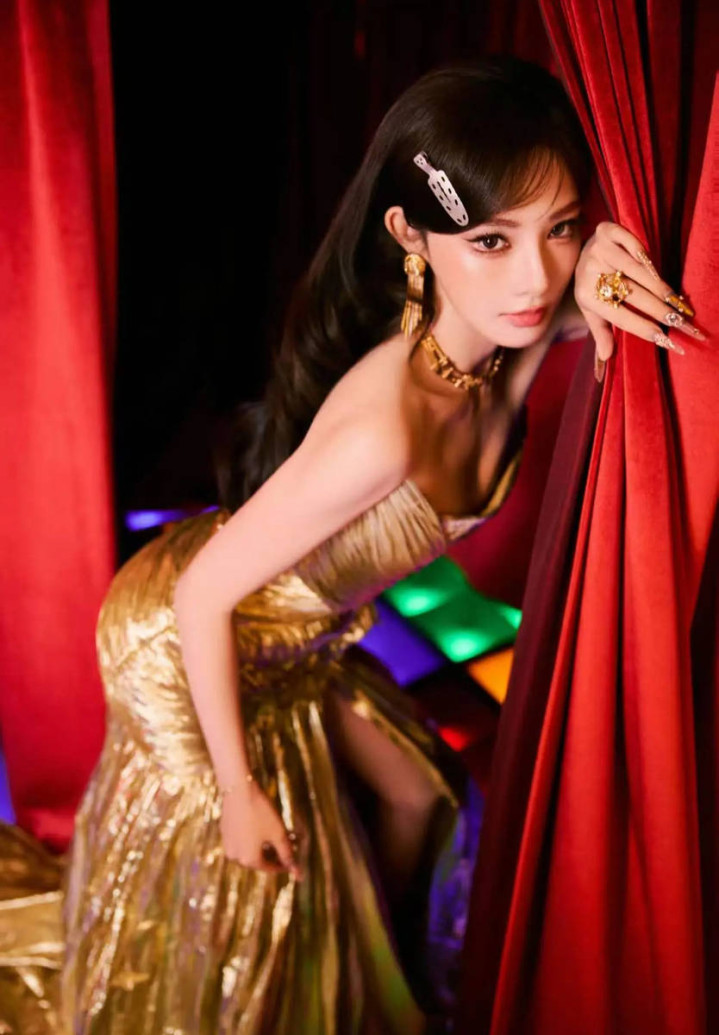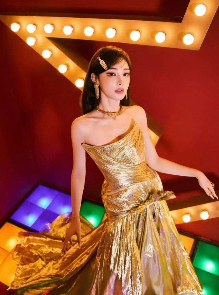一袭鎏金抹胸鱼尾礼裙加身,褶皱肌理在光影卑鄙淌着细碎金光,将唯妙身姿勾画得大书特书,宛如从老胶片里走出的金色缪斯。