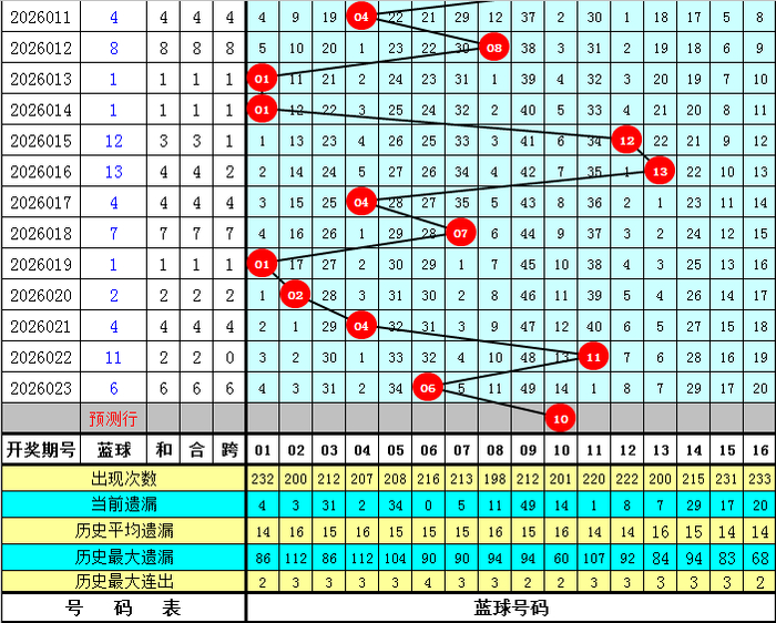蓝球分析:前5期蓝球号码分袂开出:01、02、04、11、06,其中偶数蓝球开出了3次,出现比例较高,本期瞻望蓝球再出偶数,参考蓝球号码10。