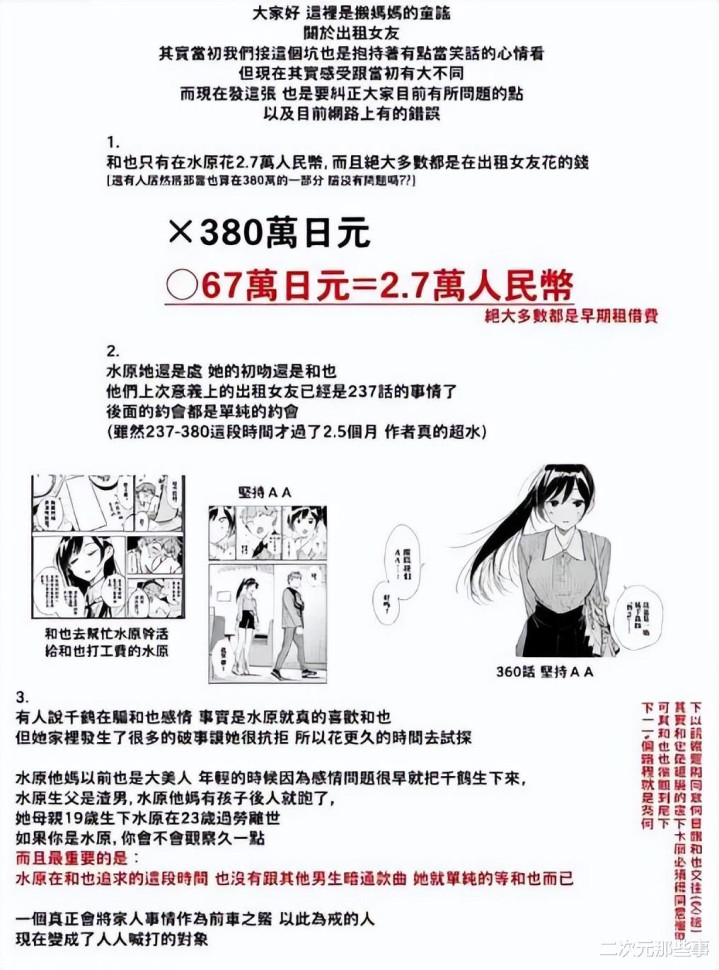 大概是因为作品的争议和负面公论着实太多了,近日,《租出女友》的汉化组亦然摄取径直下场,帮女主水原千鹤辩解。汉化组默示作品中男主木之下和也两年累计为水原千鹤破耗的资金折合成东说念主民币仅有2.7万元,并不是网传的数十万,况且绝大部分皆是平台上的租出用度。