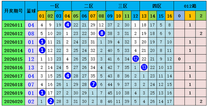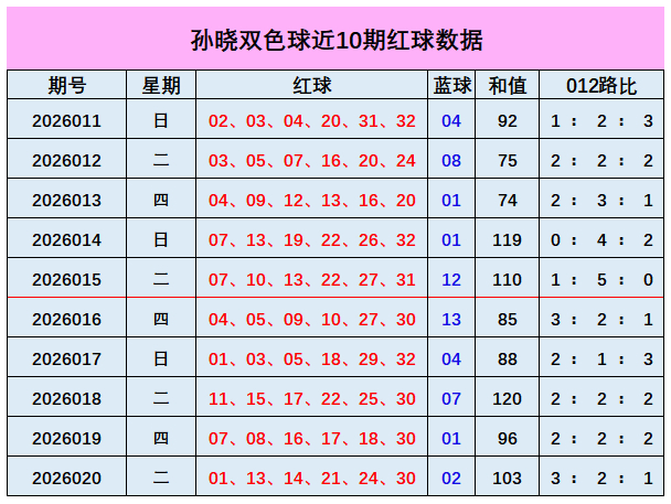 上期追溯:双色球第2026020期开出奖号:红球01、13、14、21、24、30;蓝球02,其中红球和值为103,012路比为3:2:1,奇偶比3:3,蓝球开出小偶数号码02。