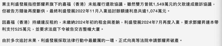 利盛发展多年前就因为邓耀昇未能实行还款契约,而指控他,其时两边曾就1549万的欠款收尾撤诉契约,不外邓耀昇之后又再度断供,最终利盛发展在2022年11月入禀高院催讨帐务策划1074万元。着力邓耀昇旗下的公司握续违背租约,连2024年头的房钱都莫得交纳,利盛发展在2024年7月又再度入禀高院,条目其连本带利偿还525万元,还条目法院下令让邓耀昇交回整座大厦。因为屡次催讨策划1599万的债务无效,利盛海外无奈只可央求邓耀昇歇业。
