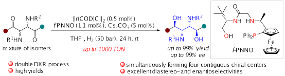 在本筹办中,配合团队期骗开拓的Ir/f-PNNO催化体系对外消旋2,3-二氨基-1,4-二酮的不合称氢化进行筹办,期骗诱惑动态能源学拆分政策,结束了含四个诱惑立体中心的手性邻二胺的高效合成。