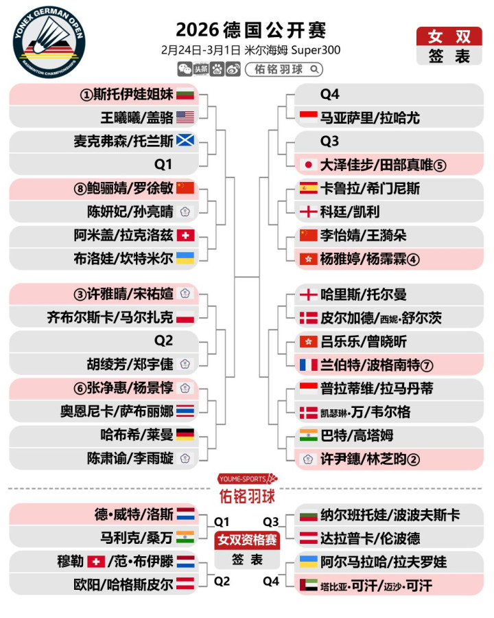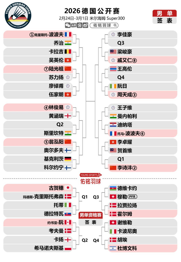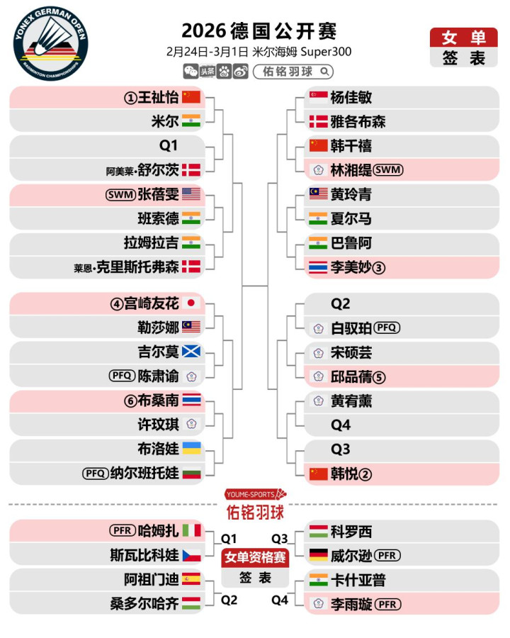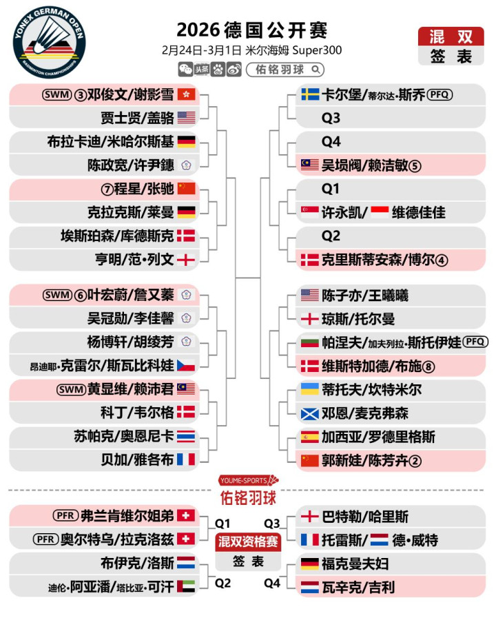 2月23日晚,宇宙羽联更新2026德国羽毛球公开赛签表,混双头号种子冯彦哲/黄东萍退赛,混双签位大调动,而女单7号种子米娅退赛,使得韩千禧首轮敌手发生变化。