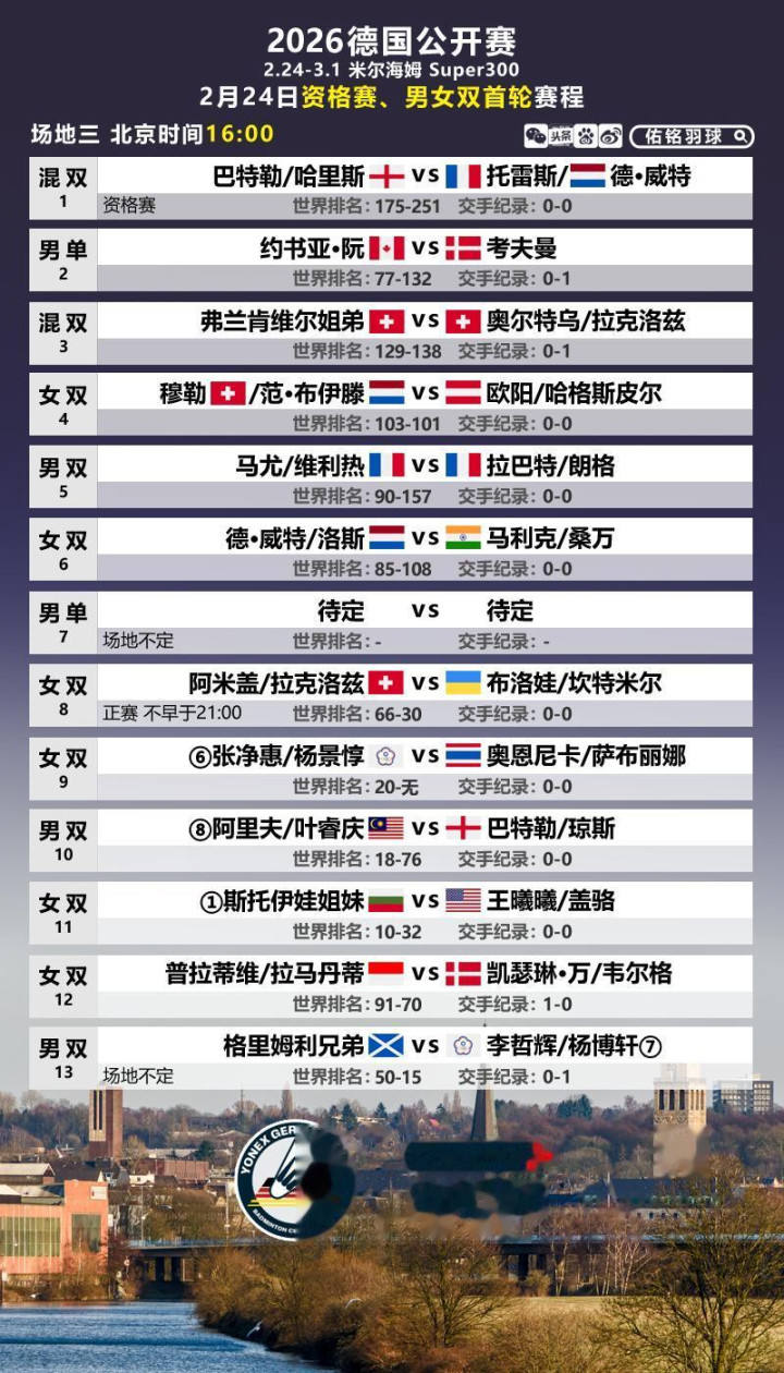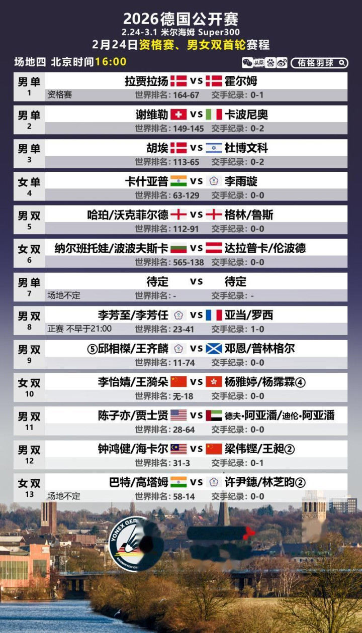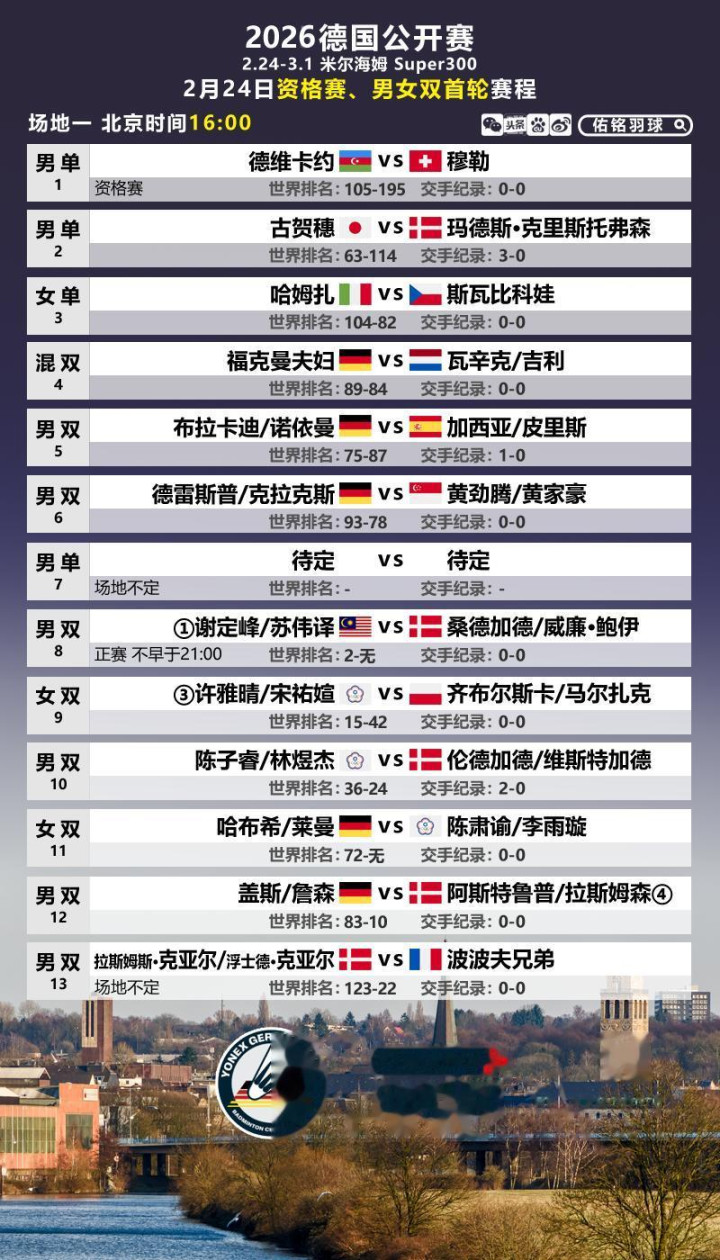 以下是2月24日首日赛程,国羽男双、女双将出战。