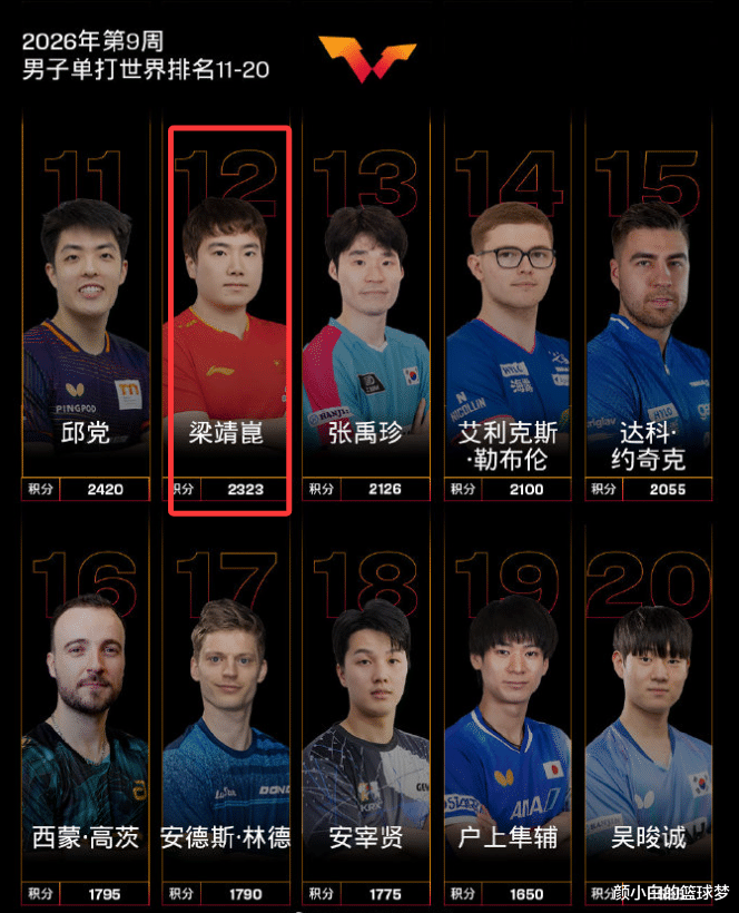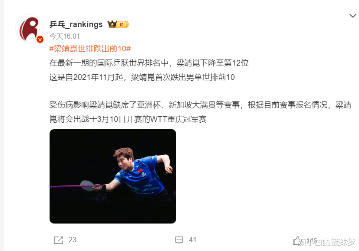 凭证乒乓Rankings的报谈,梁靖崑下跌到寰宇名次12位,这是自2021年11月(11月15日)以来,梁靖崑初次跌出男单寰宇前十,也即是1560天。