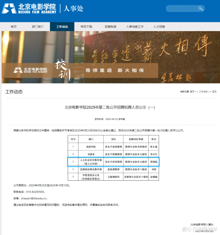 2025年9月,北京电影学院官方公告表露,乒乓球畅通员梁靖崑被拟聘为东谈主文社会科学教养部高水平体育考验,拟聘岗亭等第为考验专科时间七级岗。(梁靖崑是海外级畅通健将)是以就算梁靖崑原地退役他也有新的职责可作念。