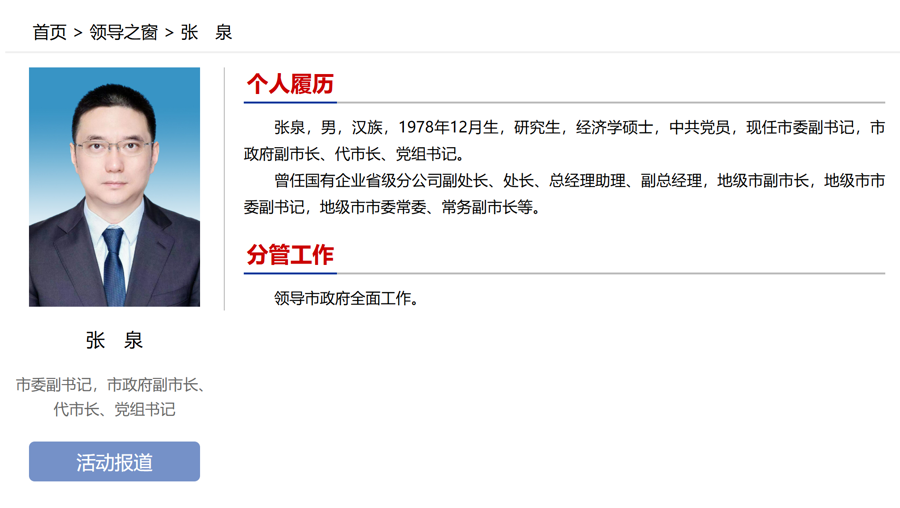 合肥市政府官网泄漏:张泉现任合肥市委副通告、市政府副市长、代市长、党组通告。曾任国有企业省级分公司副处长、处长、总司理助理、副总司理,地级市副市长,地级市市委副通告,地级市市委常委、常务副市长等。