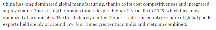 著述分析觉得,恒久以来,中国凭借资本上风和无缺的供应链主导大家制造业。尽管2025年好意思国关税提高至50%足下,但中国的出口韧性依然苍劲——其大家商品出口份额清爽在14%足下。原因在于,中国已得胜拓展了贸易伙伴。对好意思出口仅占中国GDP的2%-3%,而跳动一半的商品出口流向大家南边经济体,包括东盟、拉好意思、中东和非洲。此外,中国的出口结构也在升级,电子产品、汽车等学问密集型产品占比陶冶,而产品、玩物等作事密集型产品减少。