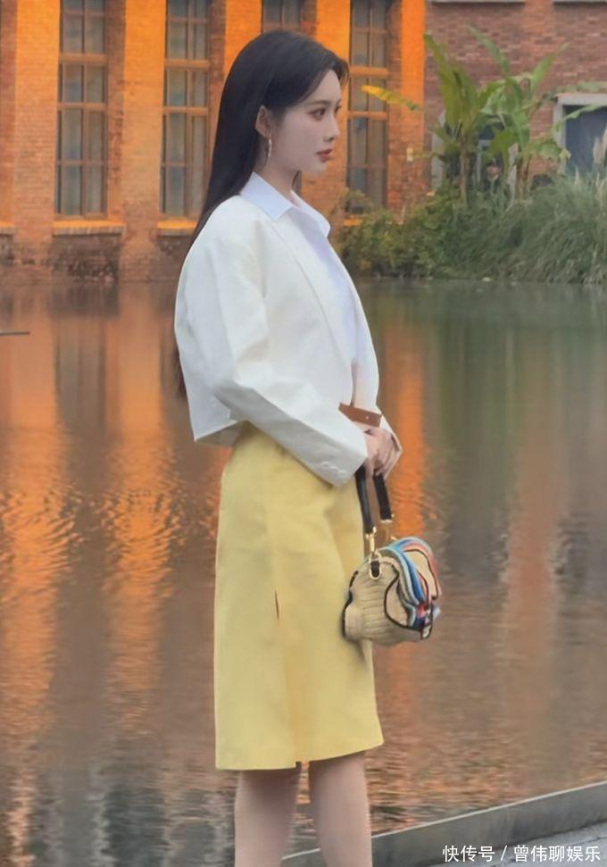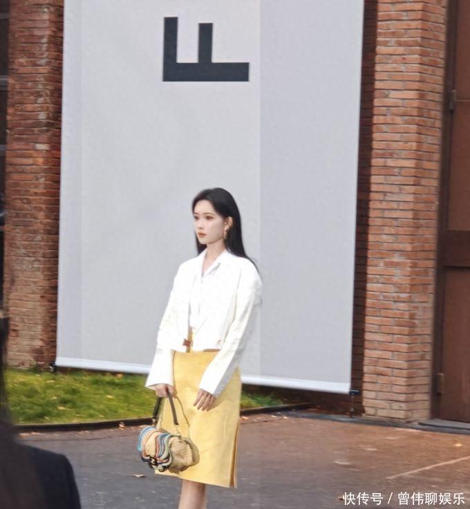 孟子义身着白色的衬衫和白色的短款外衣,下身则是一条鹅黄色的半裙,脚上一稔高跟鞋。这套服装懒散出浓厚的春日氛围,再加上她的玄色长直发型,举座造型显得既简约又前锋。